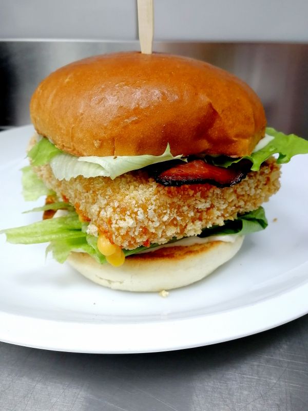 8. Burger DVOURUČÁK (hovězí mleté maso, slanina, uzený tavený sýr, pražená cibule, rajče, okurek, Coleslaw a hrst hranolek)