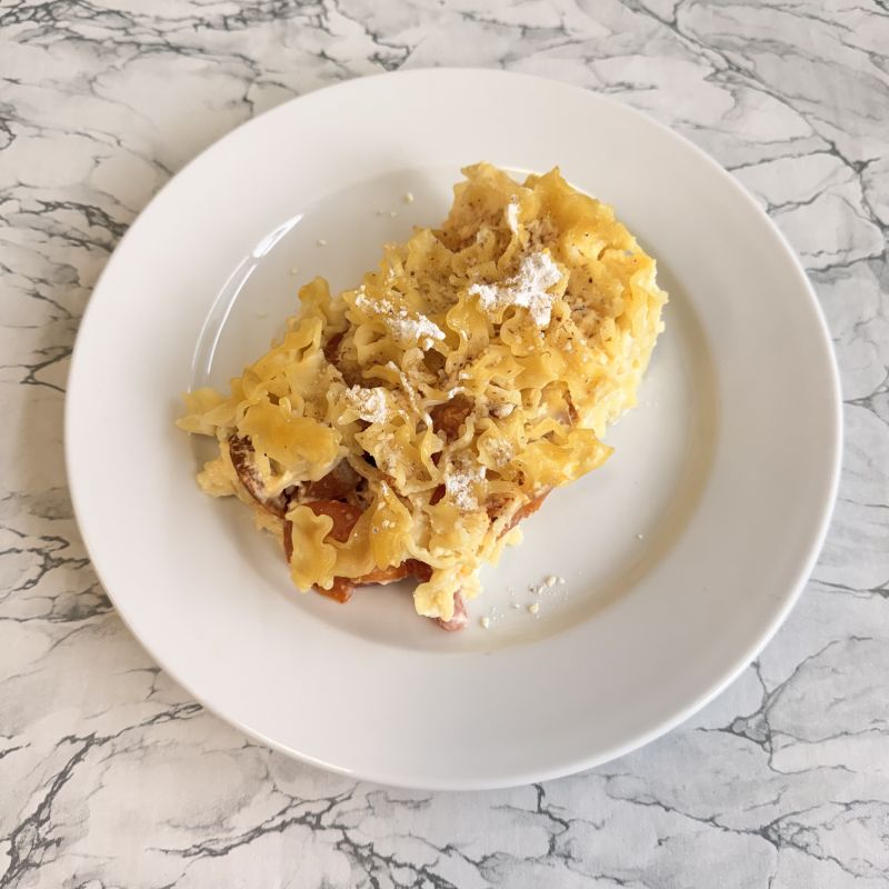 Lasagne alla Bolognese Tradiční italské lasagne s pomalu vařeným ragú z mletého hovězího a vepřového masa, vrstvami bešamelu a těstovin, zapečené s parmazánem. Alergeny: 1, 3, 7, 9