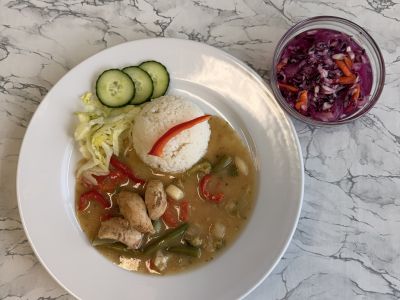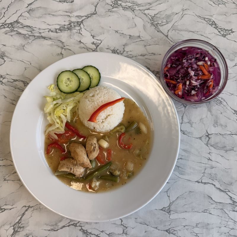 MENU 4) Pomalu pečené hovězí s kari omáčkou (kari omáčka, rýže, hovězí maso, mrkev)