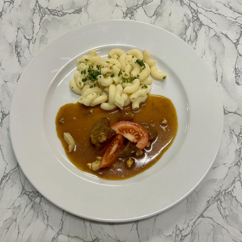 MENU 4) Hovězí maso na pepři (hovězí maso, pepřová omáčka, restovaná zelenina, smažená cibulka)