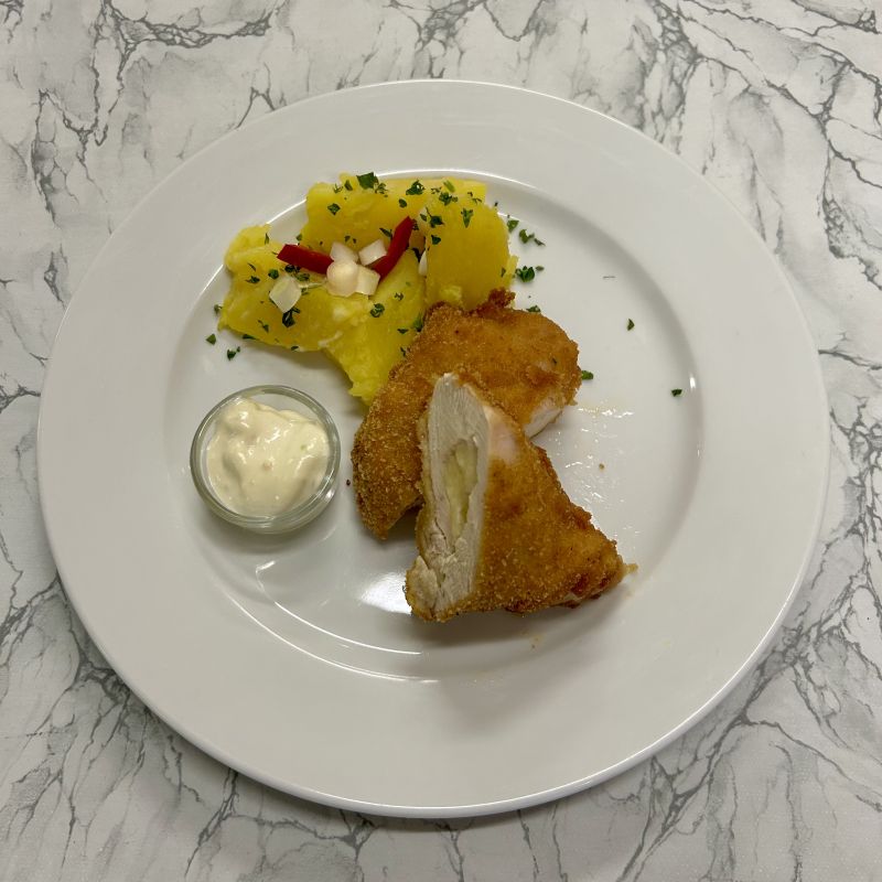 Kuřecí cordon bleu, máslová bramborová kaše, rajčatový salátek s červenou cibulkou