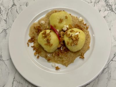 Vařené vejce, křenová omáčka s mandlemi, gnochi