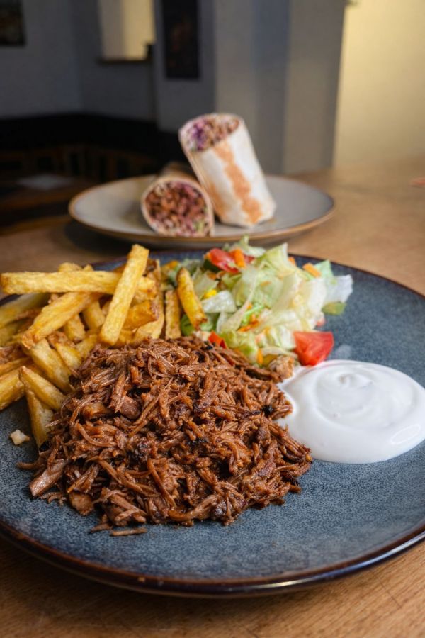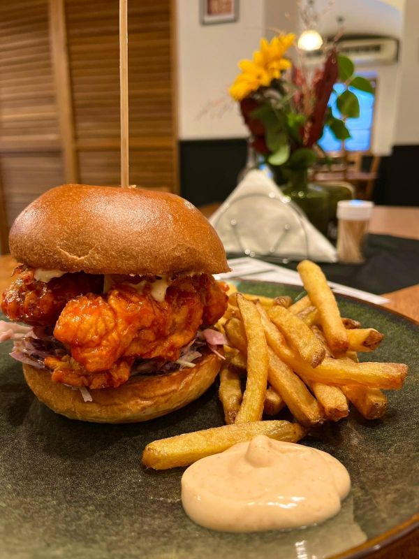 1) Hovězí burger 150 g, v naší máslové briošce + velké hranolky s domácí tatarkou, nebo kečupem v ceně.