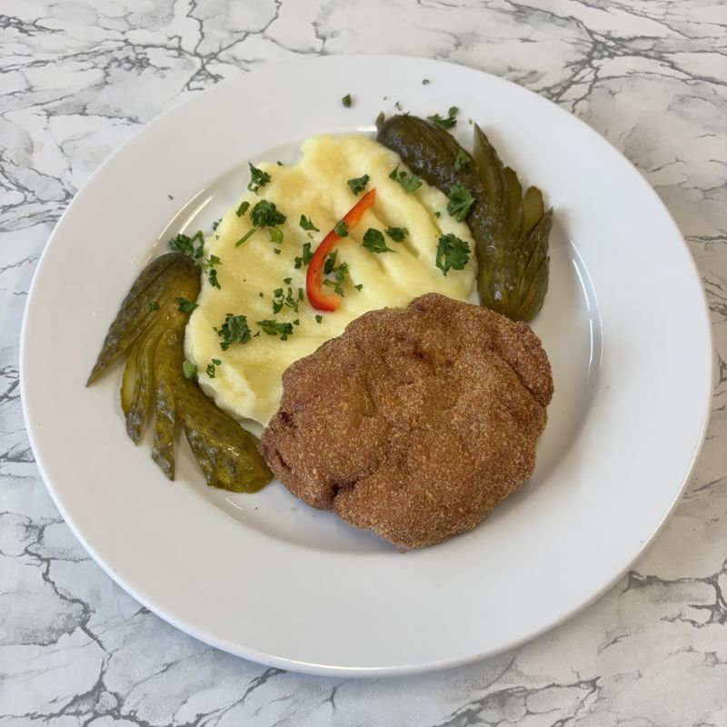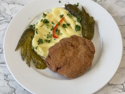 Telecí řízek s bramborovým salátem nebo bramborovými hranolkami a domácí tatarskou omáčkou 137