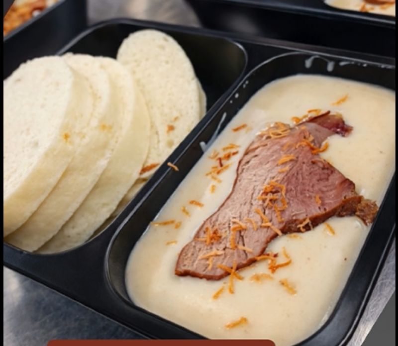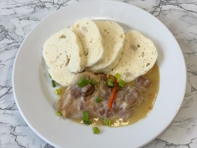 Hovězí maso po znojemsku na jemné cibulové šťávě s kyselou okurkou, houskový knedlík 13