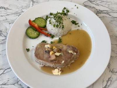 Grilovaná vepřová panenka, bylinková omáčka, šťouchané brambory 7