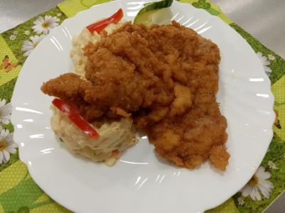 Smažený vepřový řízek, bramborová kaše