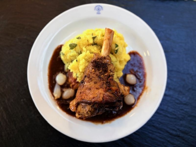 Dušené hovězí kližka s bramborem a mrkví, podáváme s bagetou