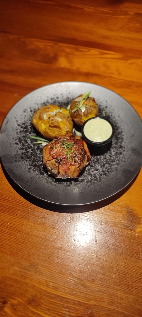 250 g Patatas Rellenas - pečené brambory ve slupce, kuřecí nudličky, kukuřice, šunka, červená cibule, zapečené cheddarem, bylinková créma 37