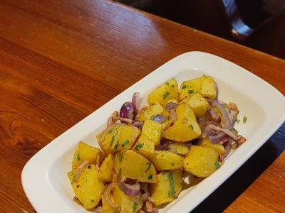 3ks Plněné bramborové knedlíky uzeným masem, červené zelí, smažená cibulka