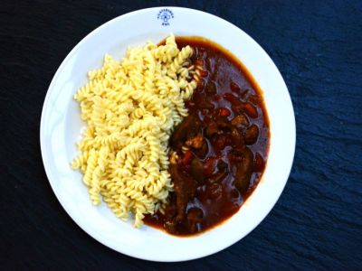 Mexický hovězí gulášek, rýže (houskový knedlík)