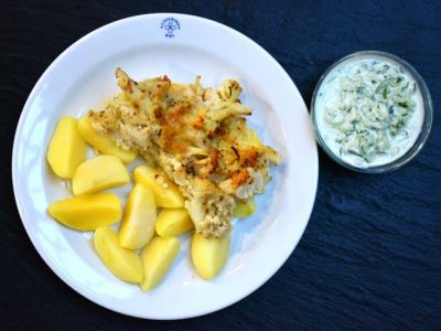 Zapečené francouzské brambory s uzeným masem, vejci a smetanou, kyselá okurka