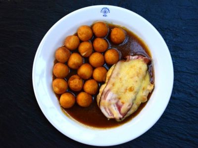 200g Kuřecí steak zapečený se šunkou a sýrem, hranolky 1, 3, 7
