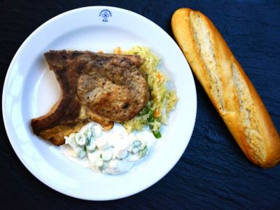 350 g Vepřová kotleta zapečená se smetanou a bramborami, salátek
