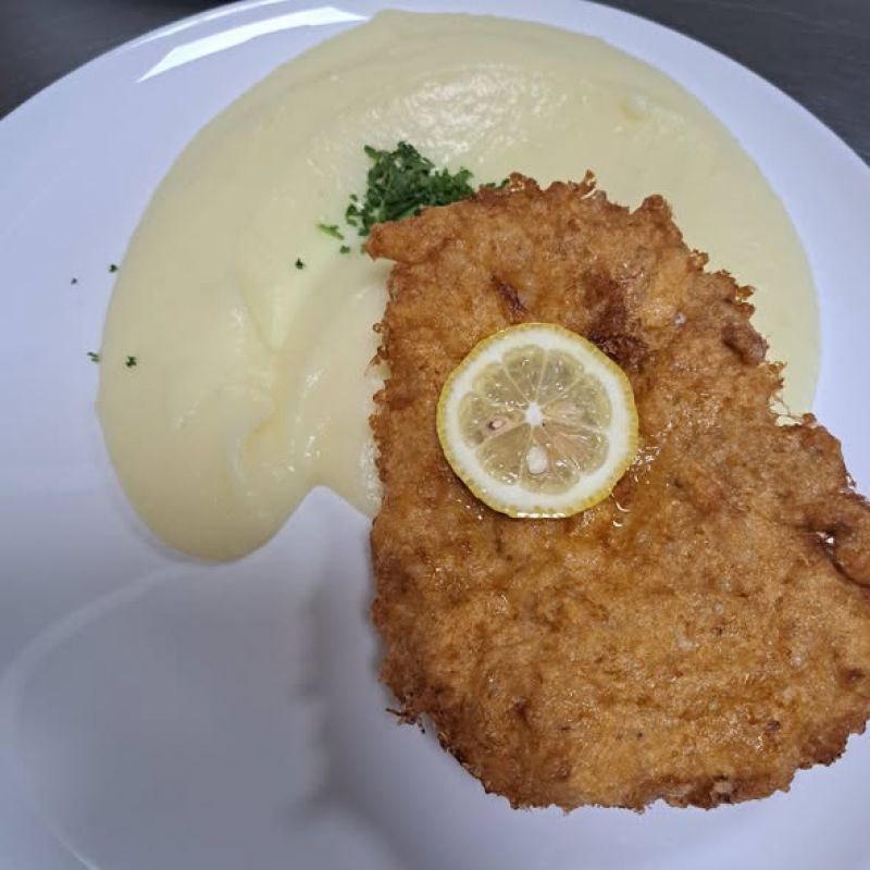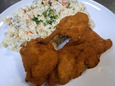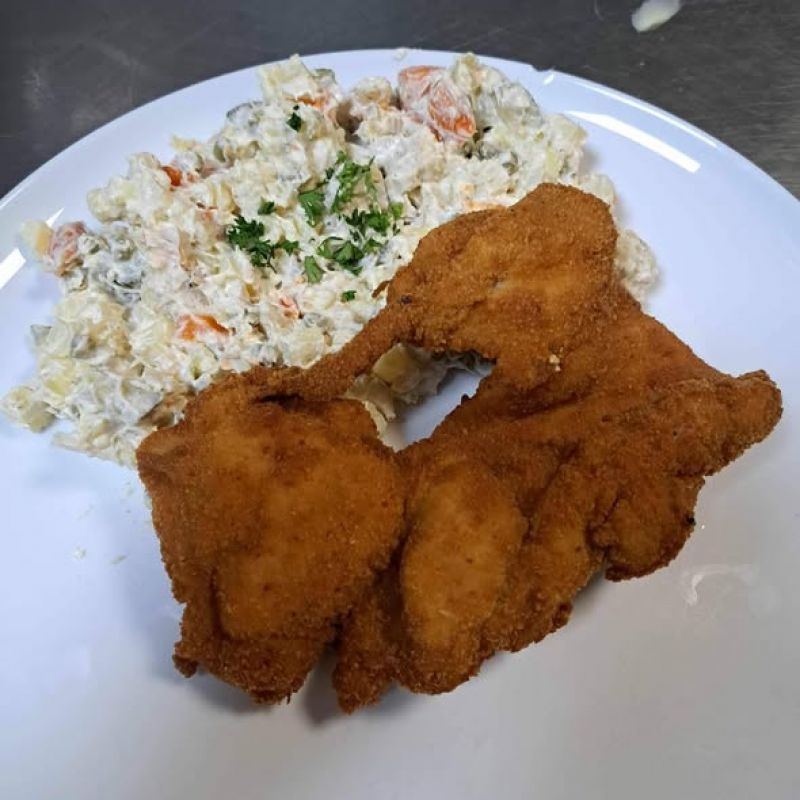 6. 150g Smažený kuřecí řízek, americké brambory