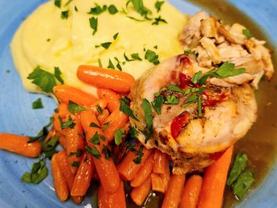 Čtvrtka pečeného kuřete, jablečný kompot, bramborová kaše…160…