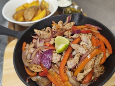 Skládaná tortilla, kuře, slanina, čedar, guacamole, hranolky
