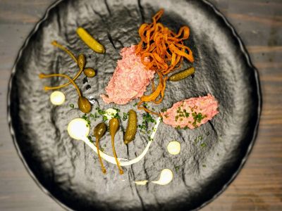 Vepřová plejskavica z mletého masa, pikantní ajvar, salátek na lehce nakládané cibule a máty, domácí pita chleba s tzatziki ledovým salátem
