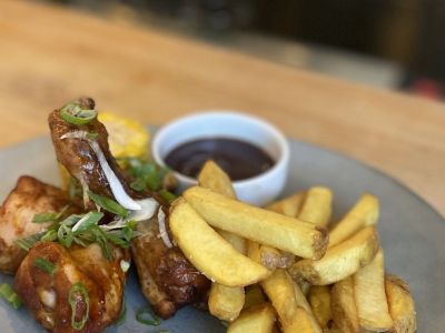 Pikantní Kentucky smažené kuře s hranolky a BBQ dipem