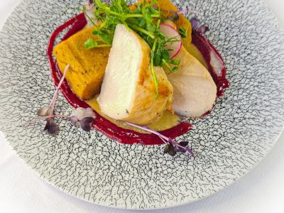 Kuřecí nadívaná ROLÁDA na másle a bylinkách, bramborová kaše, kys. okurek