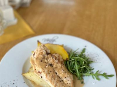Grilovaný filet LOSOSA s jemnou smet. omáčkou se suš. rajčaty, capari, bramborové NOČKY / jasm. rýže