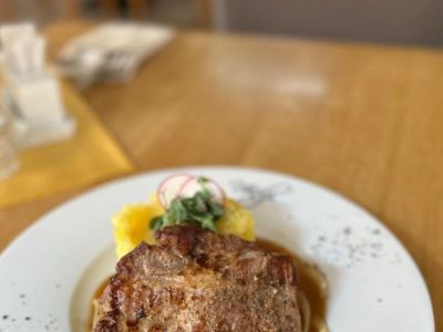 Grilovaná vepřová panenka s omáčkou z pečeného česneku, opékané brambory