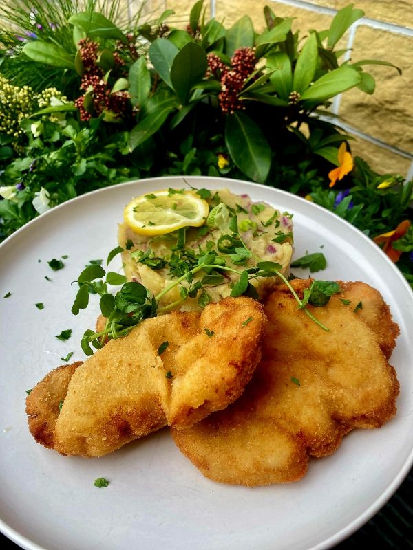 Smažený kuřecí/vepřový řízek, šťouchané brambory