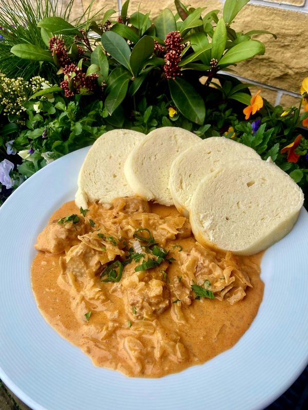 Zvěřinový guláš s kynutým knedlíkem, cibule