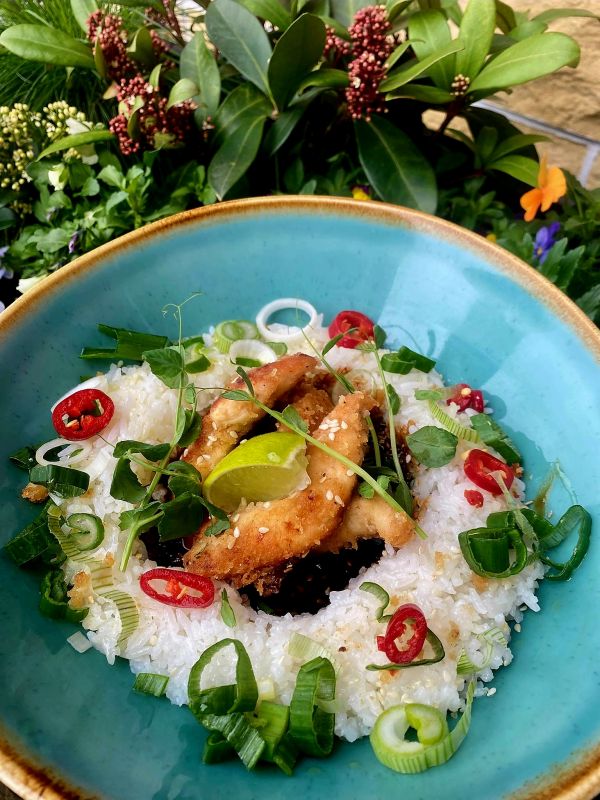 150 g Šťavnaté kuřecí prsíčko, šťouchané brambory, sypané jarní cibulkou