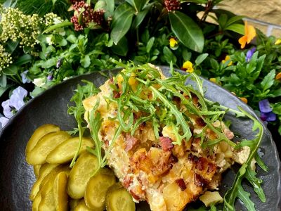 Vepřová směs se zeleninou v bramboráku, zelný salát s koprem