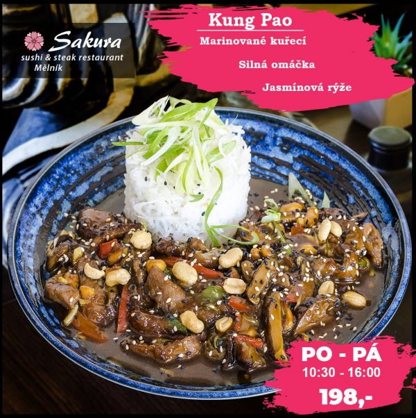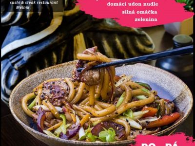 Polévka + Steak z vepřové pečeně, bouchaný brambor, chilli omáčka s višněmi.