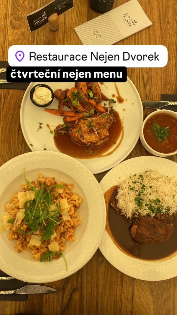 150g Hovězí váleček, špecle se slaninou a cibulkou, silná výpeková šťáva