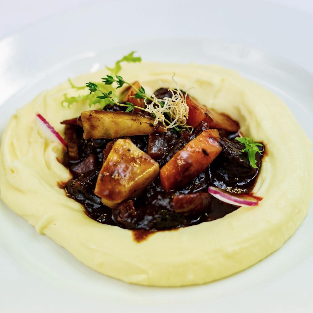 Kachna v knedlíku domácí bramborový knedlík plněný trhaným kachním masem, červené zelí, kachní šťáva, smažená cibulka