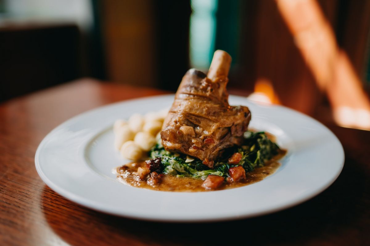 Pečené jehněčí kolínko s rozmarýnem, česnekem, listovým špenátem a bramborovými šiškami