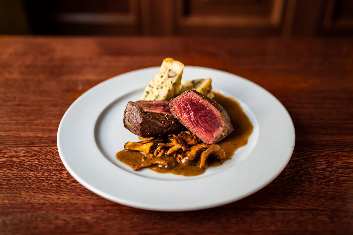 Steak z hovězí svíčkové s omáčkou demi-glace a pečenou bramborou s bylinkovou zakysanou smetanou