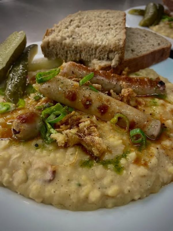 Hrachová kaše s uzeninou, cibulkou a kyselým okurkem, chleba z pece 169 FITNESS: hrachová kaše, 2ks vařené vejce, celozrné chipsy, kyselý okurek +10