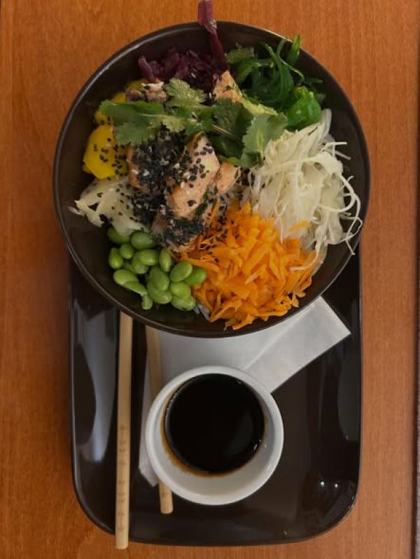 POKÉ s lososem/ tofu (rýže, zelí, mrkev, mango, wakame, edame, sezam, ústřičná om., vasabi, koriandr)
