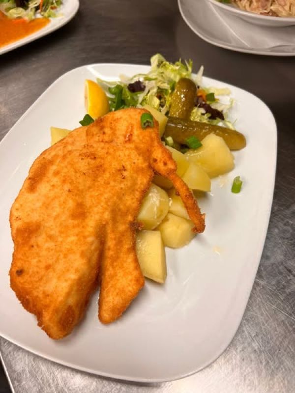 150g SMAŽENÝ KUŘECÍ/ VEPŘOVÝ ŘÍZEK, vařené brambory, kyselá okurka 1/3/7