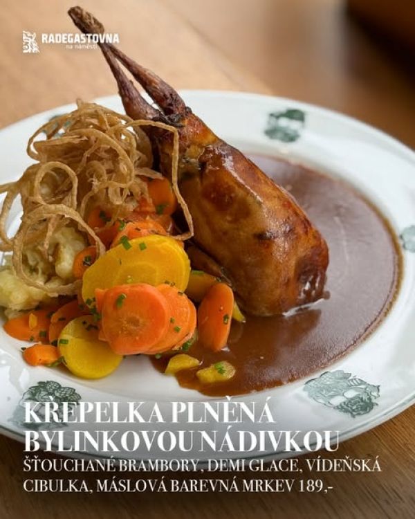 Křepelka plněná bylinkovou nádivkou, šťouchané brambory, demi glace, vídeňská cibulka, máslová barevná mrkev