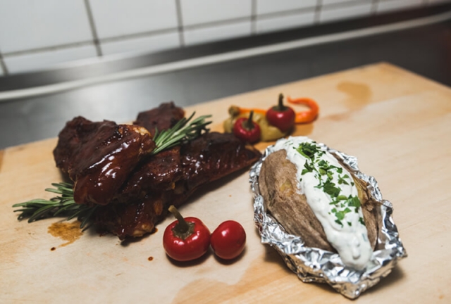 200g. Vepřový steak s omáčkou z modrého sýra, americké brambory
