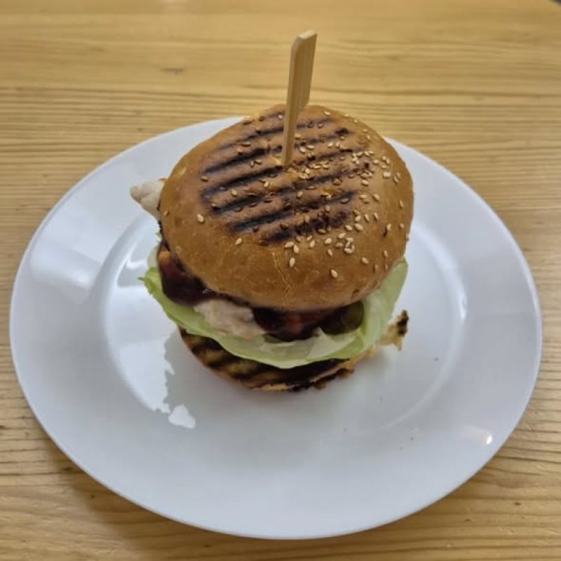 Kuřecí burger (kuřecí prso, ledový salát, rajče, okurek, BBQ omáčka, cheddar)