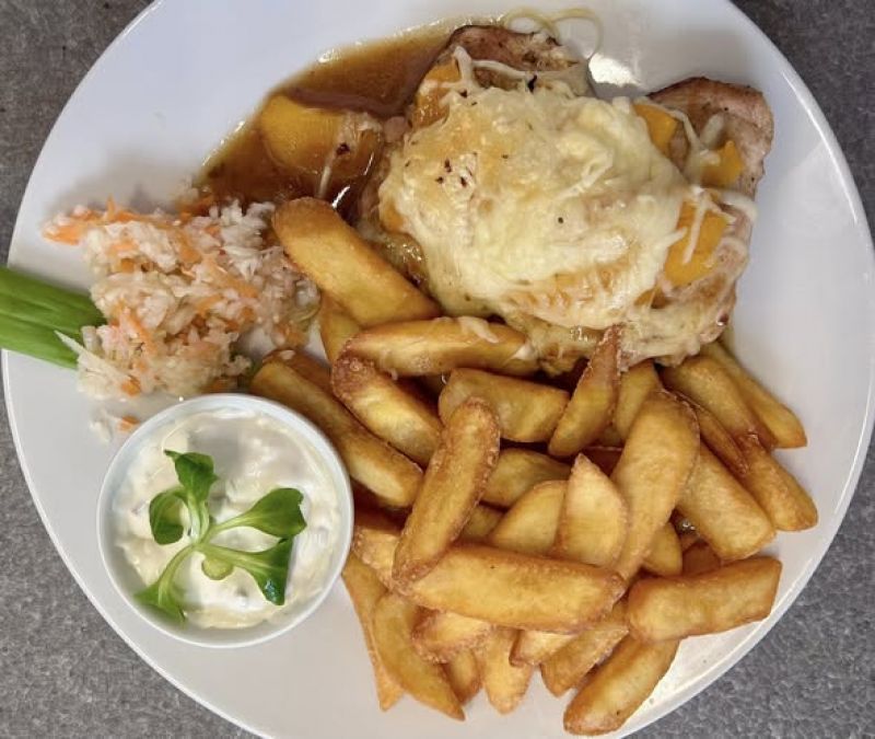 Kuřecí prsíčko s broskví a sýrem se steakovými hranolky a tatarskou omáčkou