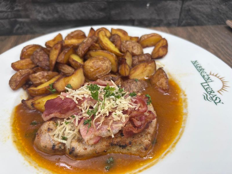150g Kuřecí plátek se šunkou a sýrem s hranolky