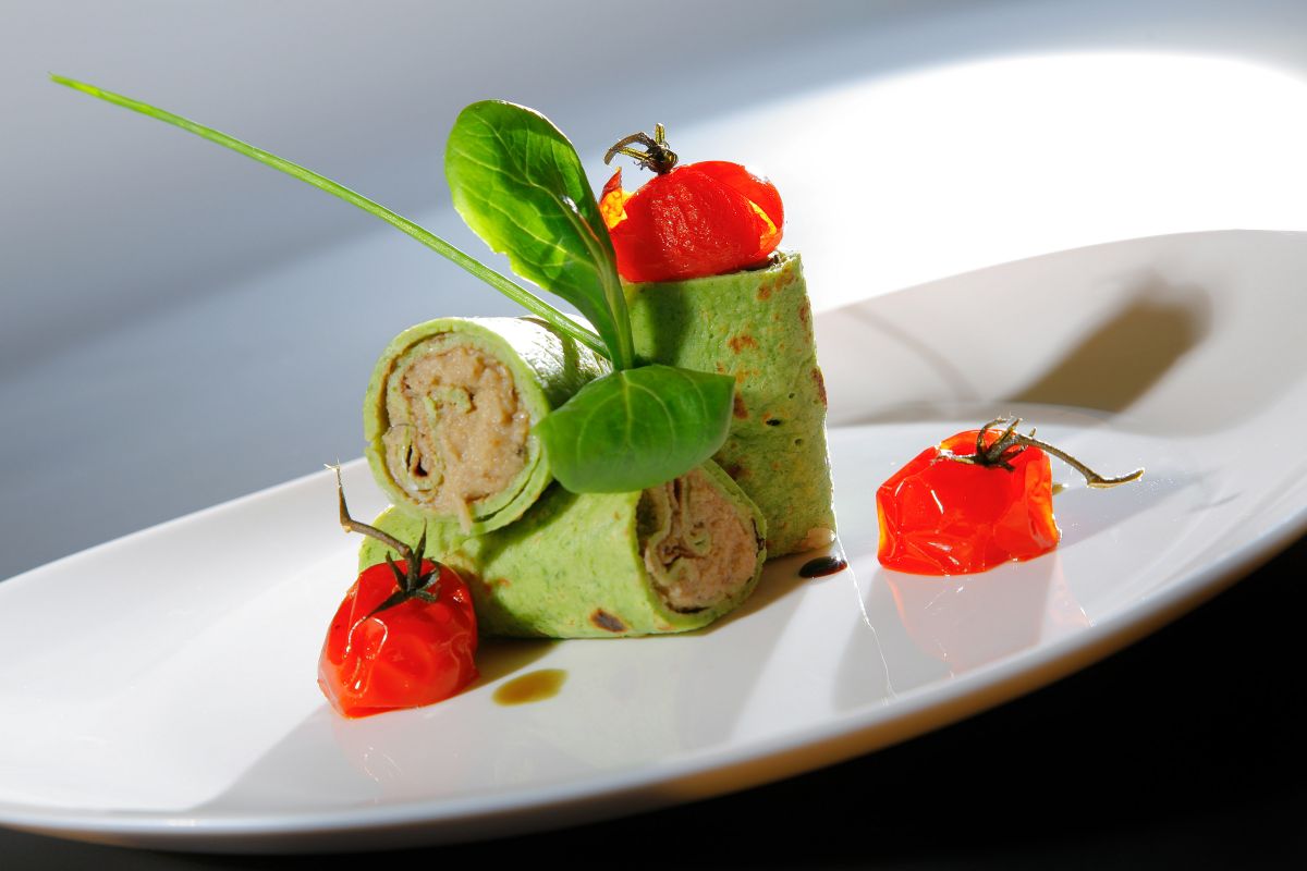 Špenátová palačinka plněná purée z pečeného lilku a bylinek, rajčatová salsa –