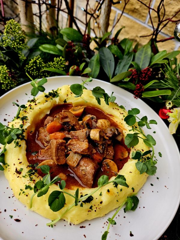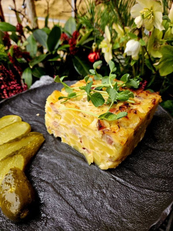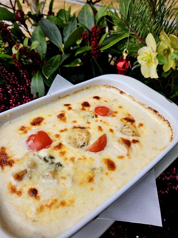 Pikantule Rimini (zapečené brambory s kuřecím masem, smetanou, rajčaty, česnekem a sýry gorgonzola a mozzarella)