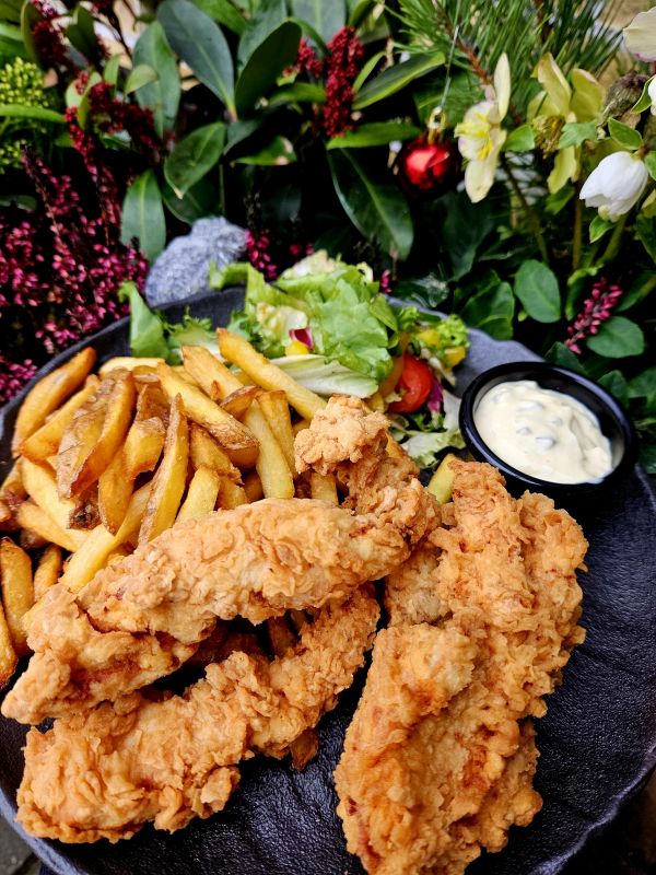 Smažené kuřecí stripsy s domácími hranolky a domácí tatarkou, malý míchaný salátek