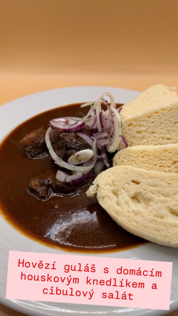 Hovězí guláš s domácím houskovým knedlíkem a cibulovým salátkem 120 g