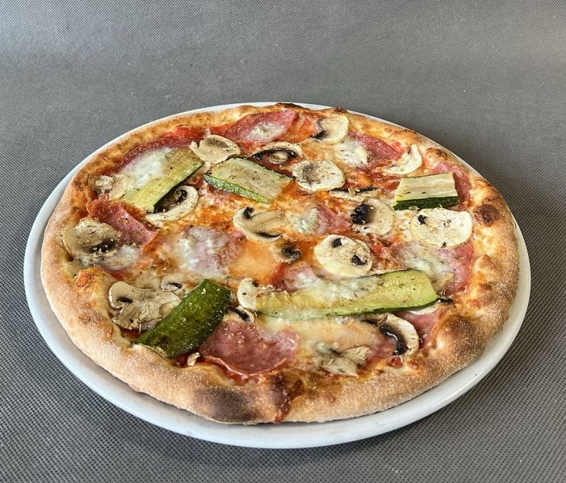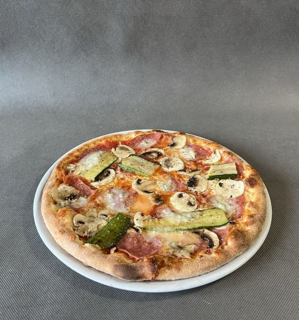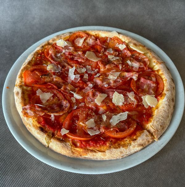 Pizza Florencia-tomaty, mozzarella fior di latte, slanina, brokolice