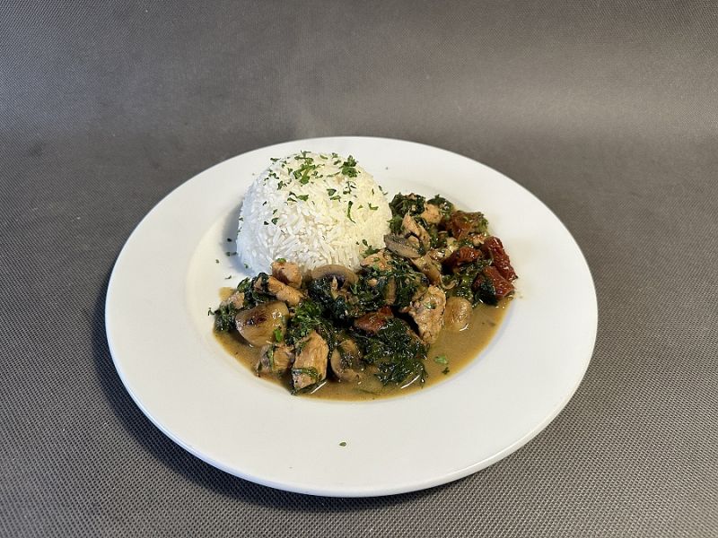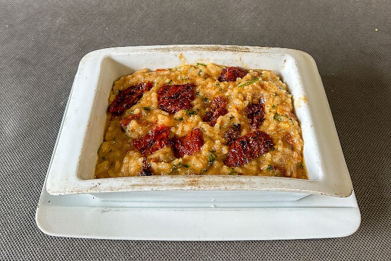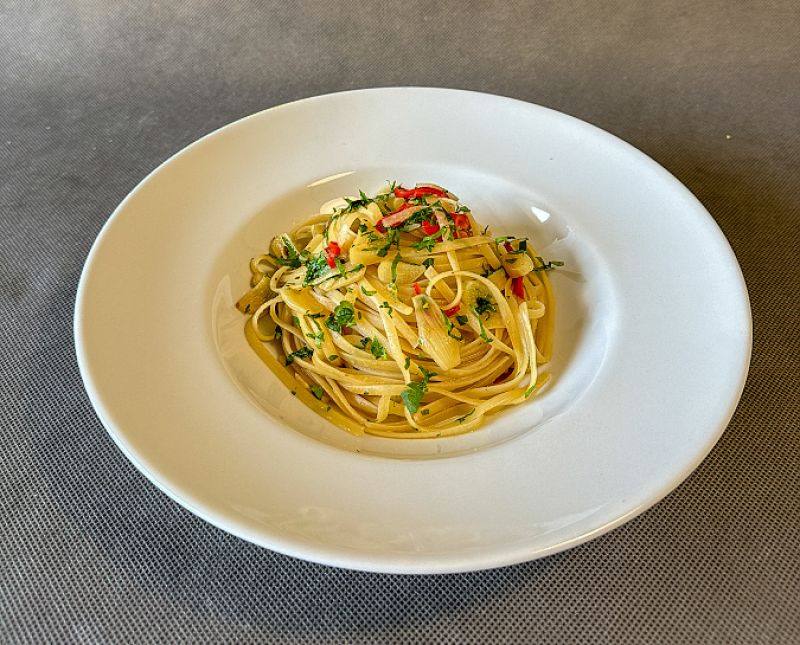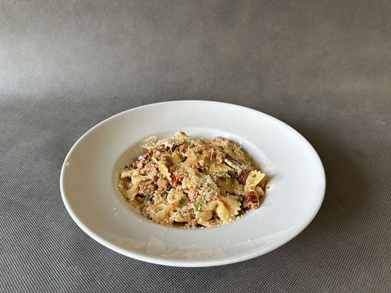 Mezze Maniche Amatriciana- těstoviny s pikantní rajčatovou omáčkou s restovanou panchettou, česnekem, vínem a paprikou, Grana Padano 24M