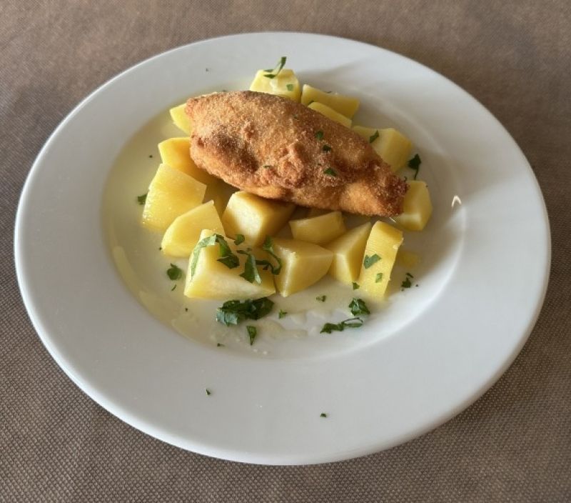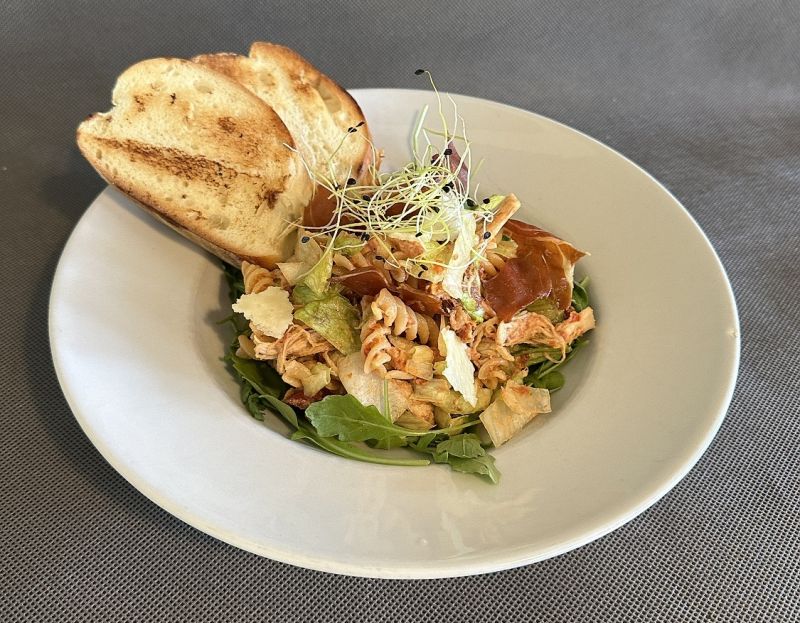 Insalata con carota-římský salát s těstovinami, vařená baby karotka, rajče, restovaný pikantní salám Ventricina, kuřecí maso, medovo-hořčičný dressing...